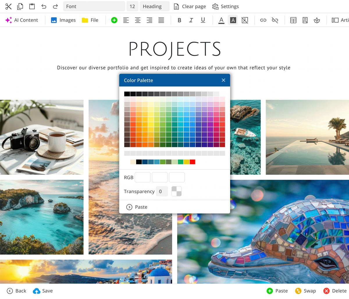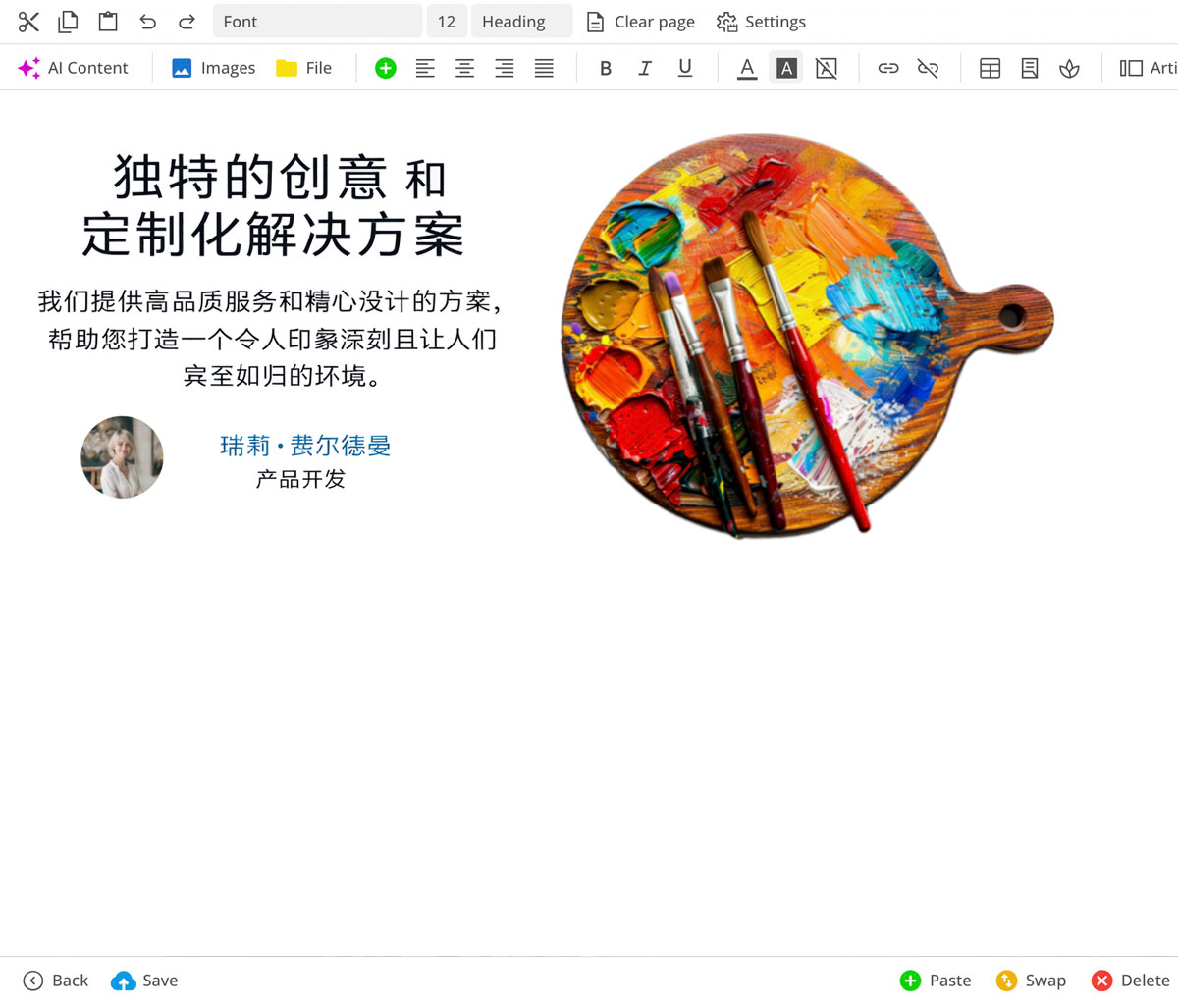 Redaktøren gir deg ulike maler for seksjoner som er nøyaktig tilpasset det valgte oppsettet. En innebygd AI hjelper til med å generere og optimalisere tekster.