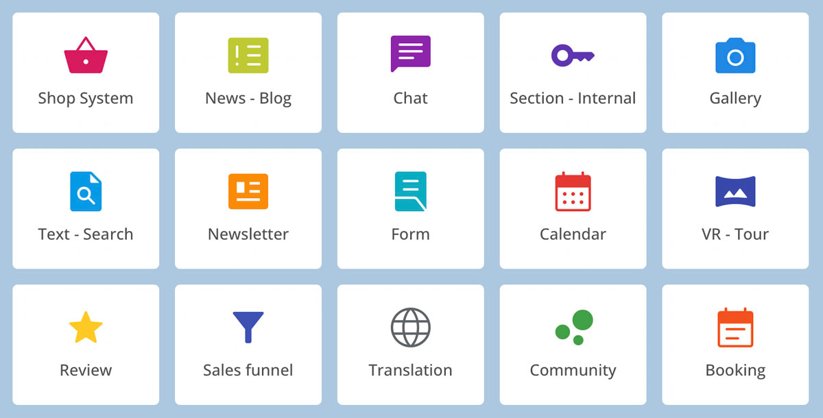 Skjemaer med Captcha-beskyttelse, bookingsystem, VR-rundturer, kalender, galleri, passordbeskyttede områder for registrerte brukere, kundeanmeldelser og mye mer.