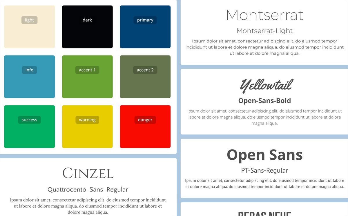 Layoutet kan enkelt tilpasses individuelt. Ulike farge- og skrifttype-sett er tilgjengelige. Også avstander, avrundinger og andre stil-elementer kan tilpasses fleksibelt.